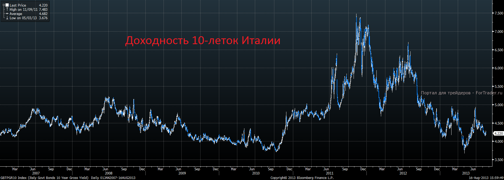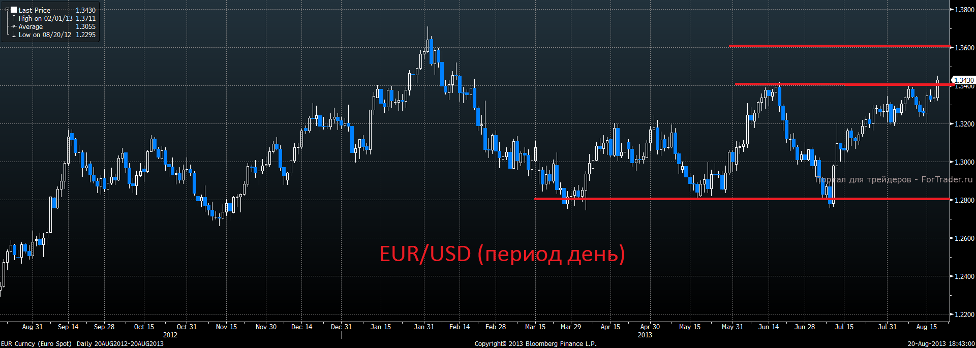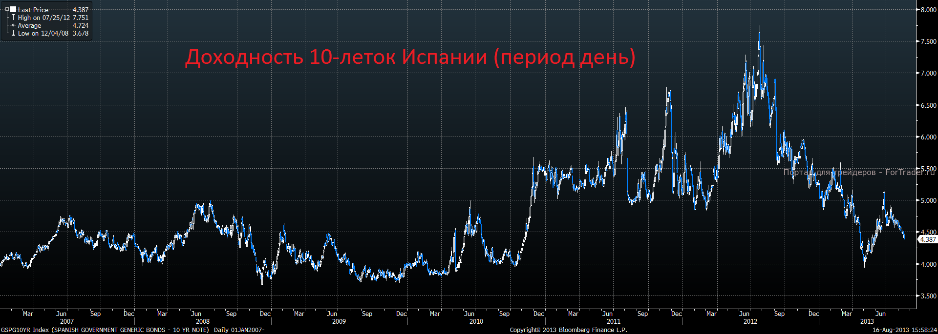 Все прекрасно понимают, что улучшение дел в южных странах еврозоны носит чисто сезонный характер и связано с туристическим сезоном, поэтому уже осенью вновь стоит ожидать ухудшение экономических показателей, а такая дорогая европейская валюта только убивает все экспортно ориентированные страны. Даже на текущий момент доходность облигаций по таким странам как Испания и Италия уже сильно переоценена и объективно не учитывает все риски, которые никуда не делись. Следовательно тот локальный приток капитала в Европу, который мы наблюдали последние 2 недели, в ближайшем будущем неизбежно сменится оттоком и мы увидим обратную динамику по ключевой валютной паре евро-доллар. В текущей ситуации мы рекомендуем аккуратно начинать формировать среднесрочные и долгосрочные короткие позиции по европейской валюте с целями 1.32, 1.30 и 1.28 до конца года.  Возможное сентябрьское сокращение программы QE-3 уже практически в цене, поэтому сильного дальнейшего давления на долговой американский рынок мы, скорее всего, не увидим.