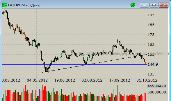 Акции «Газпрома» рассмотрим подробнее. Ниже представлен дневной график котировок по состоянию на закрытие 31 октября.