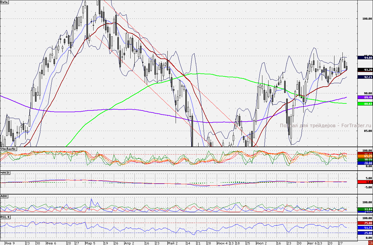 Бумаги банка могут консолидироваться в районе 10- и 21-дневных скользящих средних – чуть выше 93,2 руб. Сопротивлением является отметка 95 руб., а важной поддержкой – 92,0 руб.