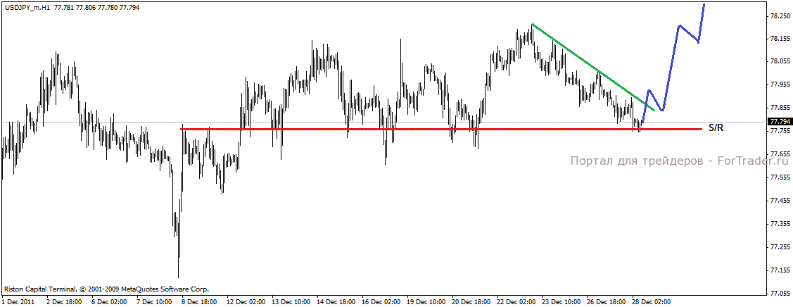 Снижение пары продолжилось и пара в очередной раз достигла уровня поддержки. Если движение так и продолжится, то в дальнейшем нас ждет продолжение снижения. В случае если отскок произойдет то следует ожидать пробоя линии трендовой, указанной зеленой линией.