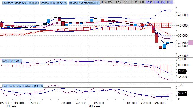 Согласно показателям индикатора Ишимоку среднесрочный тренд понижательный. Торги проходят ниже «Облака Ишимоку». Ключевые скользящие средние индикатора находятся в медвежьем пересечении, при этом быстрая смотрит горизонтально, медленная расположена горизонтально – признак смен тренда. Ключевой уровень поддержки теперь расположен на отметке 27.00 $/тройскую унцию. Первый уровень сопротивления – на 33.00 $/тройскую унцию.