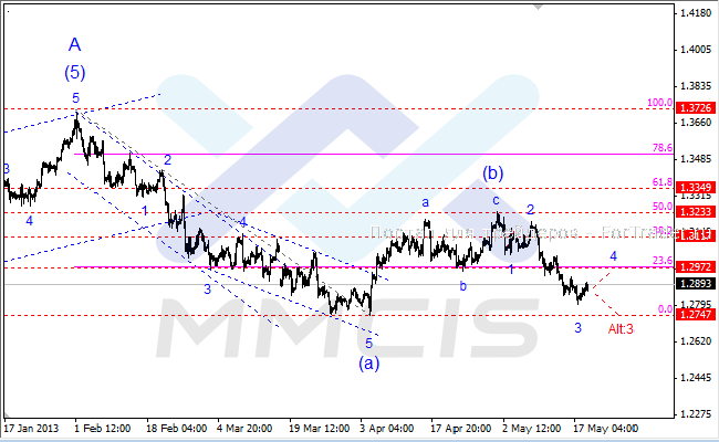 Поэтому в качестве основного сценария на сегодня можно рассматривать возможность развития восходящего движения в направлении уровня 1.2970 в рамках коррекционной волны «4». В качестве альтернативного сценария рассматривается вариант, при котором пара продолжит снижение в виде усложненной структуры волны «Alt:3».