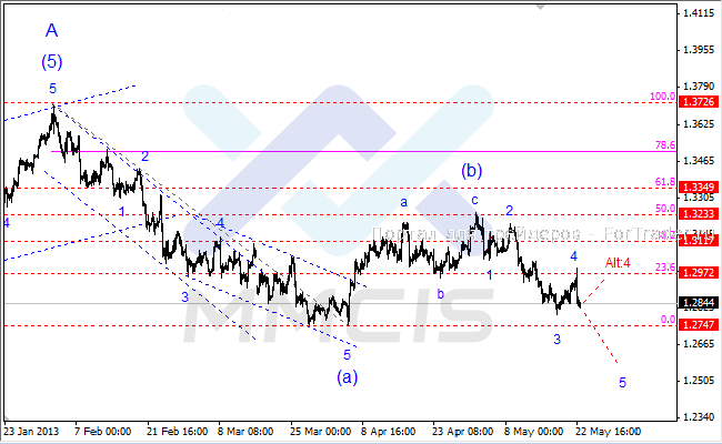 Поэтому основным сценарием на сегодня аналитики считают дальнейшее снижение котировок в направлении уровня 1.2747 с его последующим прорывом в рамках волны «5» нисходящего импульса. Альтернативный сценарий предполагает повторное тестирование уровня 1.2972 в рамках усложненной структуры волны «Alt:5».
