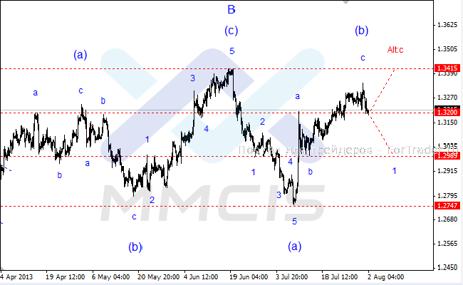 Поэтому в качестве основного сценария развития событий трейдерам следует рассматривать вариант дальнейшего снижения котировок в направлении уровня 1.30 в рамках волны «1» нисходящего импульса «С». В качестве альтернативного сценария рассматривается возможность кратковременного роста котировок в район 34-й фигуры в рамках усложненной структуры волны «Alt:c».