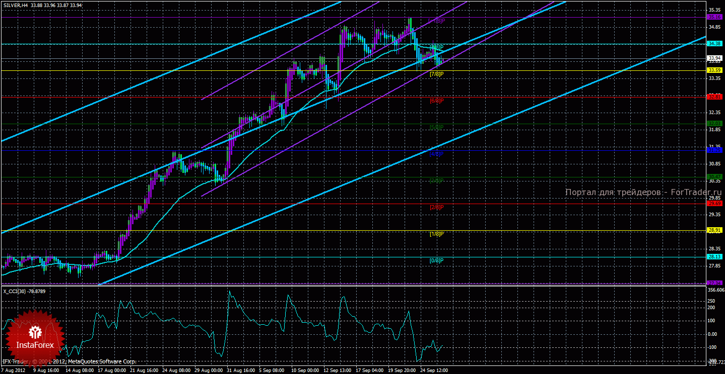 Исходя из анализа серебра 26 сентября, видно, что инструмент продолжает коррекцию и закрепился ниже скользящей средней, поэтому коррекция может получиться глубокой. Старший канал направлен наверх, что свидетельствует о восходящем направлении движения глобального тренда. Младший канал направлен наверх, что означает восходящее движение в менее долгосрочном плане. Сейчас цена находится ниже мувинга и ниже уровня Мюррея «8/8», что делает более вероятным продолжение нисходящего движения. Первой целью нисходящего движения является уровень Мюррея «7/8» — 33,59, но рассматривать короткие позиции сейчас преждевременно. В случае преодоления ценой этой отметки, новой целью для нисходящего движения станет уровень Мюррея «6/8» — 35,94. Скользящая средняя направлена вбок, а цена в свою очередь находится ниже нее, что сигнализирует о текущем нисходящем направлении движения. Короткие позиции можно будет вновь рассматривать, если развернется вниз один из каналов линейной регрессии. Ордера на покупку можно будет рассматривать только после закрепления цены выше скользящей средней. Хайкен Аши окрасил последние бары в голубой цвет, что сигнализирует о локальном нисходящем движении. Индикатор CCI находится около уровня -100, что свидетельствует о небольшой перепроданности инструмента.