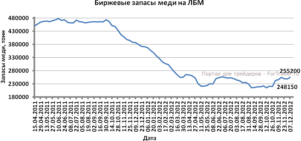 Тем не менее, более мрачные оценки относительно перспектив европейской экономики сдерживали рост котировок меди. Так, по оценкам европейского регулятора, в следующем году экономика региона сократится на 0,3%, в то время как всего три месяца назад прогнозировался рост ВВП на 0,5%. Что касается 2014 года, то ЕЦБ ожидает роста экономики на 0,2-2,2%. Повысившийся биржевой запас данного актива на Лондонской бирже металлов (ЛБМ) на текущей неделе также препятствовал росту котировкам красного металла.