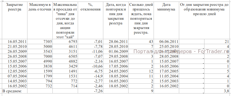 Пришло время познакомиться с дивидендной истории акции ГМК «Норильский никель». Я не стала изощряться и смотреть, как акции себя вели на промежуточных закрытиях реестра. Приведу данные по главным отсечкам года. Акции ГМК «Норильский никель» побили рекорды всех ранее представленных акций по скорости обновления пиков дня закрытия реестров. В среднем, всего 9 дней приходится ждать этого события, а среднее отклонение акций за этот период бывает 7,26%.
