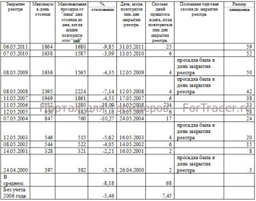 Впрочем, выбор за вами, данные представлены в обоих разрезах. Мой вывод следующий: учитывая средний процент отклонения бумаг от пика дня закрытия реестра до дня его обновления (8,18/5,46%) я бы однозначно не стала предпринимать «шорты» в день закрытия реестра или сразу после дня отсечки.