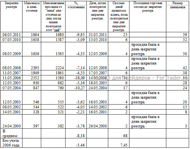 Очень приятно, когда твои обзоры живут. Мне понравилось, что после вчерашнего обзора по префам «Сбера» трейдеры засмотрелись на графики, и стали искать другие аналогии, которые случаются в период отсечек. В частности, участником социальной сети трейдеров после дополнительного анализа графиков привилегированных акций «Сбербанка», была высказана следующая теория: «Количество дней до повторения пика дня закрытия реестра напрямую зависит от того, на каком тренде происходит отсечка реестра, растущем или падающем. Я просмотрел период с 2006 года, и получилась следующая картина. В 2011, 2010 и 2007 годах отсечка происходила на падающем рынке, и максимумы цен были показаны за несколько дней до отсечки. Поэтому и цена восстанавливалась долго. А в 2009, 2008 и 2006 годах отсечка происходила на восходящем тренде, и цена восстанавливалась быстро. Отсюда напрашивается вывод, что учитывая то, что мы сейчас находимся на нисходящем тренде, цена будет восстанавливаться долго, и есть смысл «шортить» бумагу на отсечке». Подчеркну – это частное мнение трейдера. Мне нравится ход мыслей, но, естественно, я проверю его слова, а уже потом буду использовать. Но мое мнение насчет «шорта» под отсечку привилегированных акции «Сбербанка» не изменилось. Для меня он неприемлем. Тем не менее, у каждого своя стратегия.