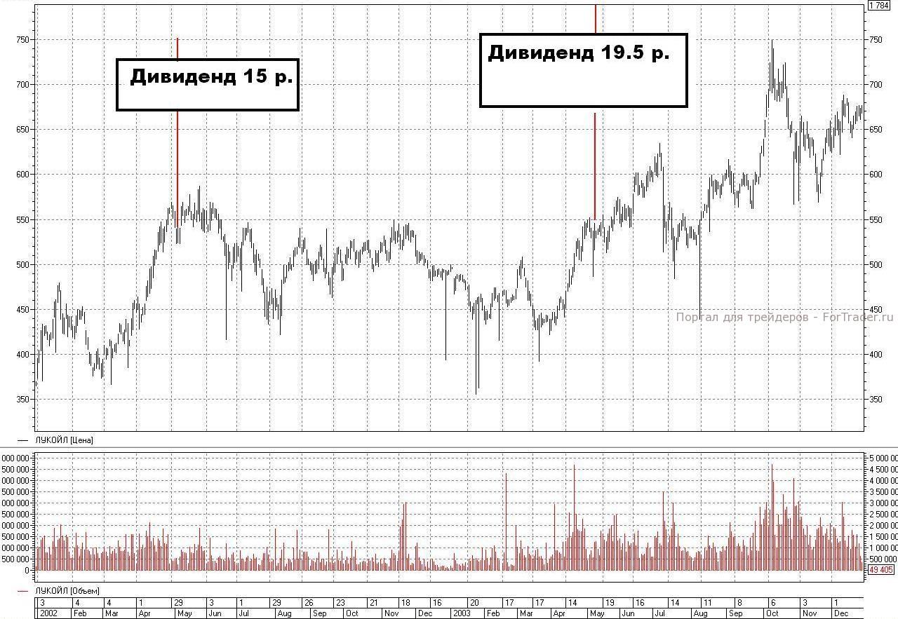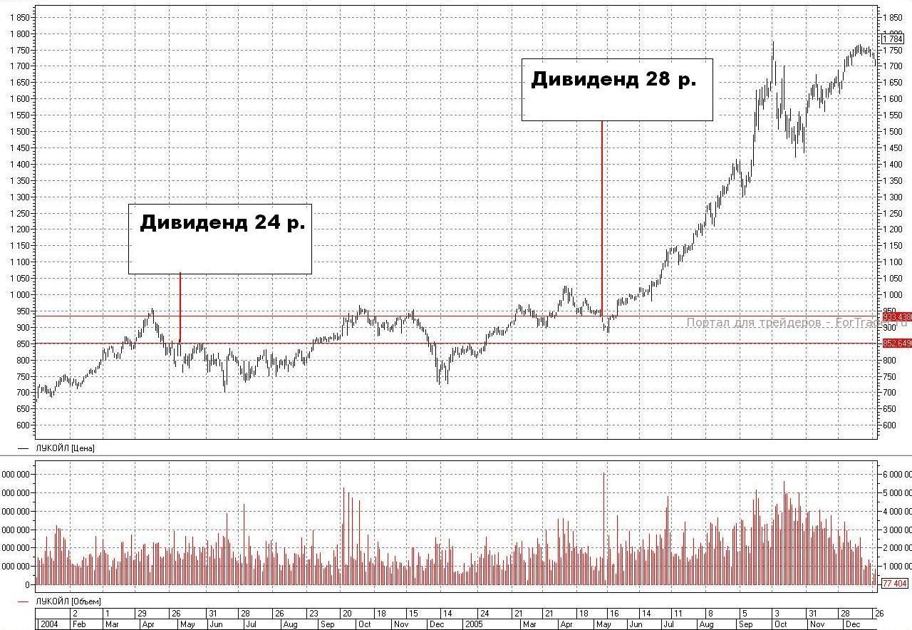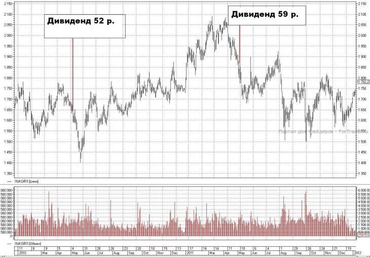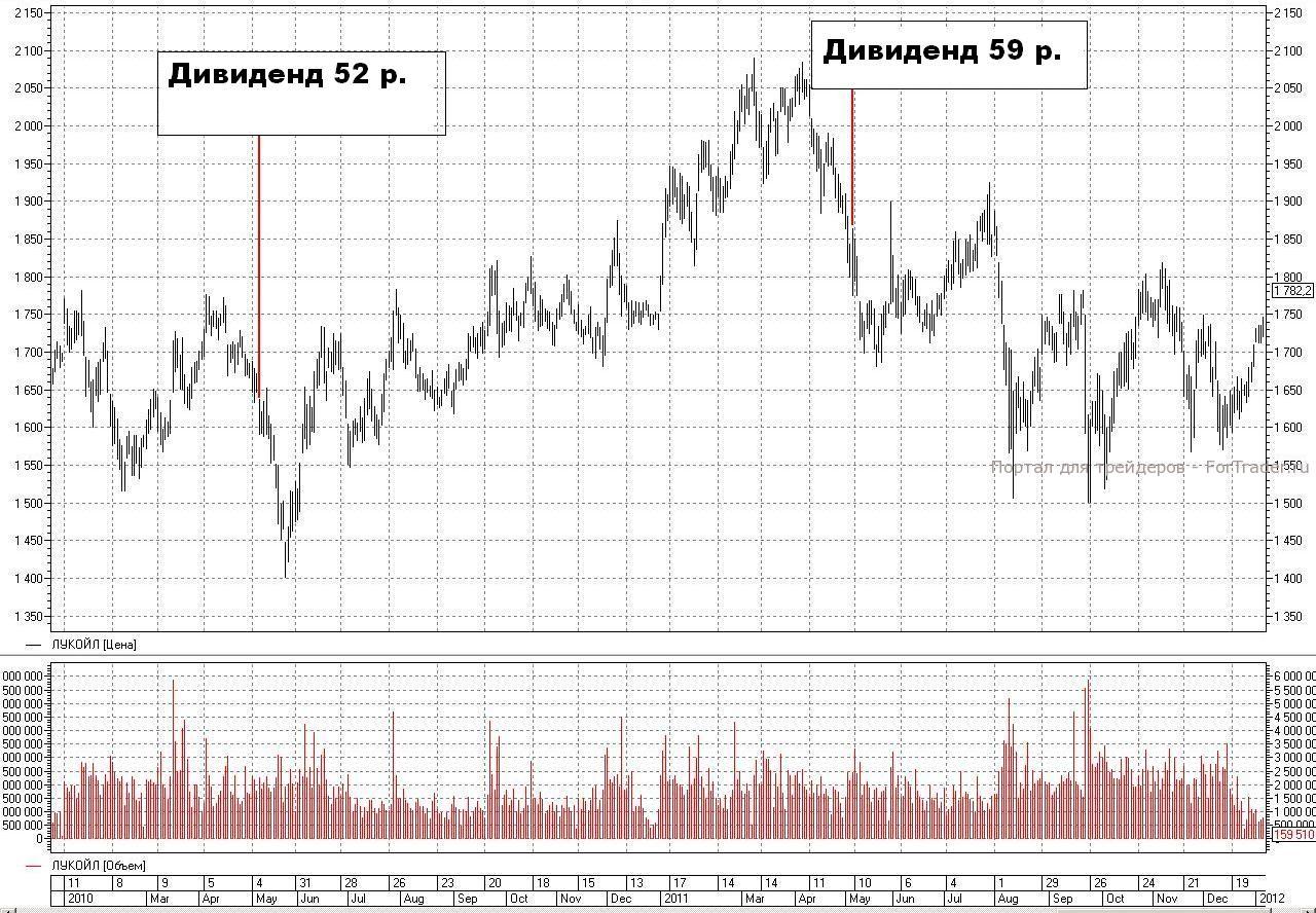 Вернемся к «ЛУКОЙЛу». Если вы тоже захотите сделать выводы, сравнив предшествующие тренды и последующую реакцию цены после отсечки – облегчу вам задачу и предложу графики. Ох, не скрою, пока ставила на графиках дивиденды, не один раз, достаточно пошло хихикнула над их размером… Но у нас столько сейчас направлений исследований, что размер дивиденда и его влияние на поведение бумаг после закрытия реестра или собрания акционеров пока не имеют значения.