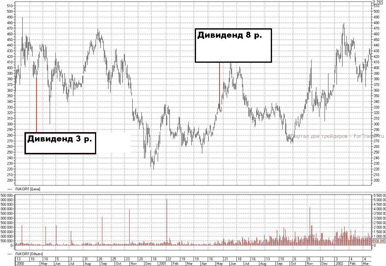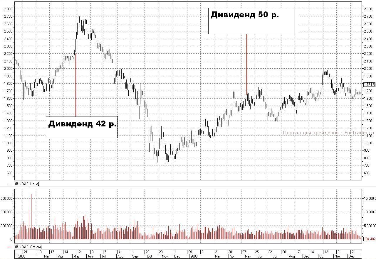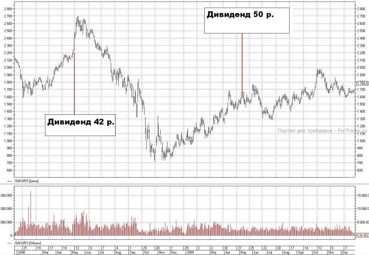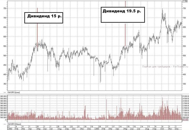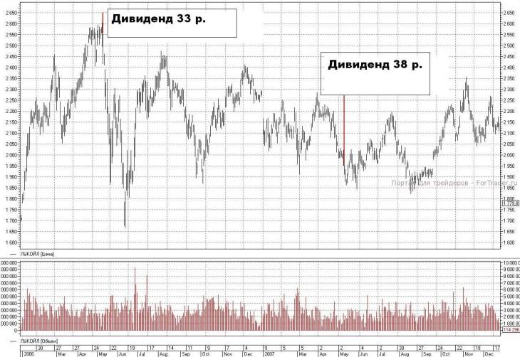 Вернемся к «ЛУКОЙЛу». Если вы тоже захотите сделать выводы, сравнив предшествующие тренды и последующую реакцию цены после отсечки – облегчу вам задачу и предложу графики. Ох, не скрою, пока ставила на графиках дивиденды, не один раз, достаточно пошло хихикнула над их размером… Но у нас столько сейчас направлений исследований, что размер дивиденда и его влияние на поведение бумаг после закрытия реестра или собрания акционеров пока не имеют значения.