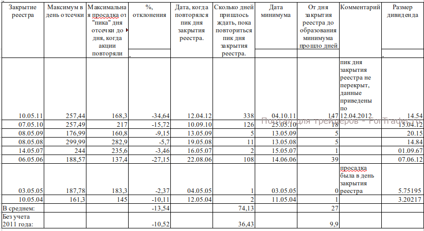 Итак, что будет с нашим счетом, если мы купим бумаги «МТС» под отсечку? За время исследования дивидендных историй я разобрала порядка десятка эмитентов, но даже «ВТБ» всегда перекрывал пики дня закрытия реестра. Первое, что бросается в глаза, это то, что пик закрытия реестра 2011 года не перекрыт до сих пор. Поэтому я приведу данные с учетом 2011 года и без учета этого явления. Если вы купите акции «МТС» в расчете на дивиденды по пику дня закрытия реестра, то для того, чтобы их продать по той же цене, вам придется ждать в среднем 74,13 дня (с учетом 2011 года) или 36,43 дня (без учета). Но, согласитесь, это все равно многовато… Я добавила в свою таблицу еще данные о датах образования минимумов между пиками дня закрытия реестра и днями, когда они обновлялись. Получилась интересная картина. Средний процент отклонения 13,54/10,52% и он достигается достаточно быстро — от 27 дней (с учетом 2011 года), до 9,9 дня (без учета). То есть, после закрытия реестра можно посмотреть варианты для «шорта». Но для моей стратегии «шорт» не подходит. Поэтому через 10 деньков после закрытия реестра я буду поглядывать на тренды «МТС». Возможно, там появятся сигналы к позитивному развороту, а значит, и восстановлению к пику дня закрытия реестра. Ну, а дальше, исходя из тогдашних уровней, будем смотреть, и считать риски и доходность.