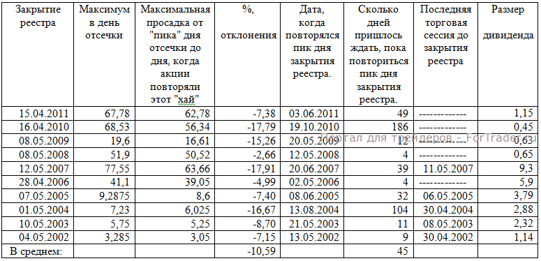 Итак, первый вопрос, который меня интересует, стоит ли среднесрочным инвесторам продавать акции заведомо до закрытия реестра? Как видно из таблицы, если даже купить акции по пиковой цене дня закрытия реестра, то до тех пор, пока этот «хай» повториться, средние просадки составляли 10,59%. Я думаю, это не критично для тех, кто торгует на средний срок. Но ждать, когда акции «выпустят» с дивидендами, и по той же цене, что была максимальной в день закрытия реестра, в среднем приходится 45 дней. А это уже немало, хотя бы в психологическом плане, для тех, кто покупает бумаги с прицелом 3-4 месяца/полгода.