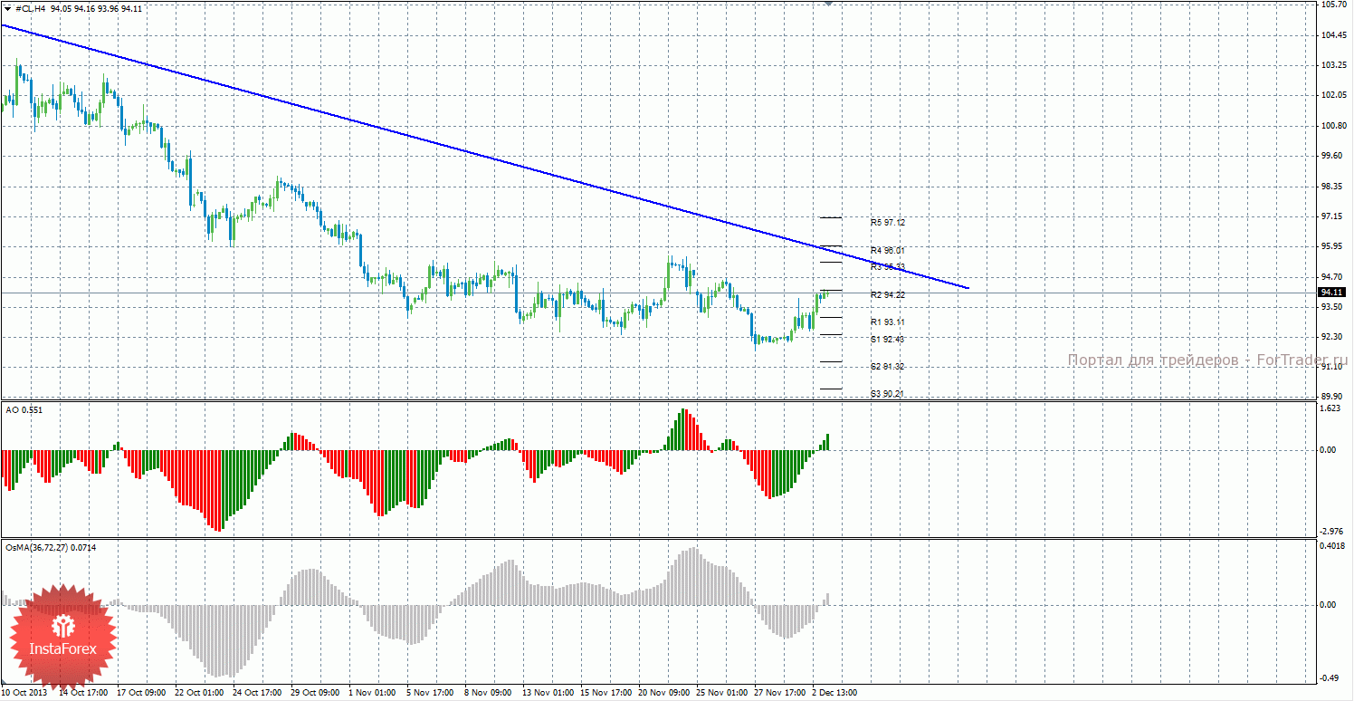 Анализ сырой нефти за 3 декабря показывает, что цена начала продолжает коррекционное движение и закрепилась выше уровня сопротивления 93,11. Нисходящее движение может возобновиться с целями R1– 93,11 и S1 – 92,43, если цена отскочит от уровня 94,22. Может продолжиться виток восходящей коррекции с целями 95,33 и 96,01, в случае, если цена закрепится выше уровня 94,22. Нисходящая линия тренда сейчас является актуальной и оказывает поддержку торгующим на понижение. Индикатор Awesome показывает текущее восходящее движение, так как последний закрытый бар зеленого цвета. OsMA также направлен наверх, что говорит о восходящем характере движения и в более долгосрочном плане. Отскок цены от уровня 94,22 может спровоцировать завершение восходящей коррекции.