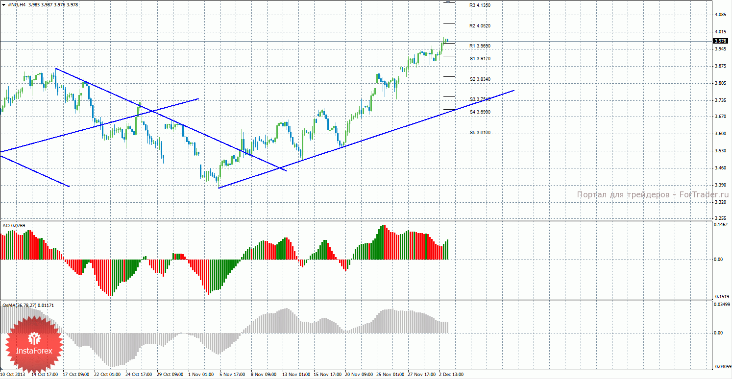 Анализ природного газа за 3 декабря показывает, что цена индикатор OsMA продолжает разряжаться, а цена продолжает восходящий тренд. На данный момент актуально восходящее движение с целями — уровни сопротивления R2 — 4,0520 и R3 – 4,1350, если цена останется выше уровня 3,9690. Целями для возможного начала нисходящей коррекции выступают уровни поддержки 3,9170 и 3,8340, если цена закрепится ниже уровня 3,9690. Восходящая линия тренда оказывает поддержку торгующим на повышение, ниже нее цена закрепиться пока не смогла. Индикатор Awesome показывает локальное восходящее движение, последний закрытый бар окрашен в зеленый цвет. OsMA же направлен вниз, что сигнализирует о нисходящем движении цены на газ и в более долгосрочной перспективе. Индикатор OsMA сейчас продолжает разряжаться. Закрепление ниже уровня 3,9690 может спровоцировать виток нисходящей коррекции.