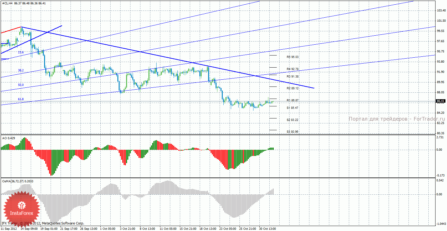 Анализ сырой нефти за 1 ноября показывает, что сейчас актуальны короткие позиции, но цена находится между уровнями S1 и R1, поэтому сейчас продолжается период неопределенности. Нисходящая линия тренда поддерживает торгующих на понижение, но цена располагается довольно далеко от нее. Короткие позиции, таким образом, актуальны с целями S2 – 83,22 и S3 – 80,96, но для этого требуется закрепление цены ниже уровня 85,47. Возможно также продолжение коррекционного движения с целями 86,87 и 89,12. Пока что цена находится между уровней S1 и R1 и не определилась с направлением торгов. Индикатор Awesome показывает текущее восходящее движение, так как последний закрытый бар зеленого цвета. OsMA также направлен наверх, что говорит о восходящем характере движения и в более долгосрочном плане.