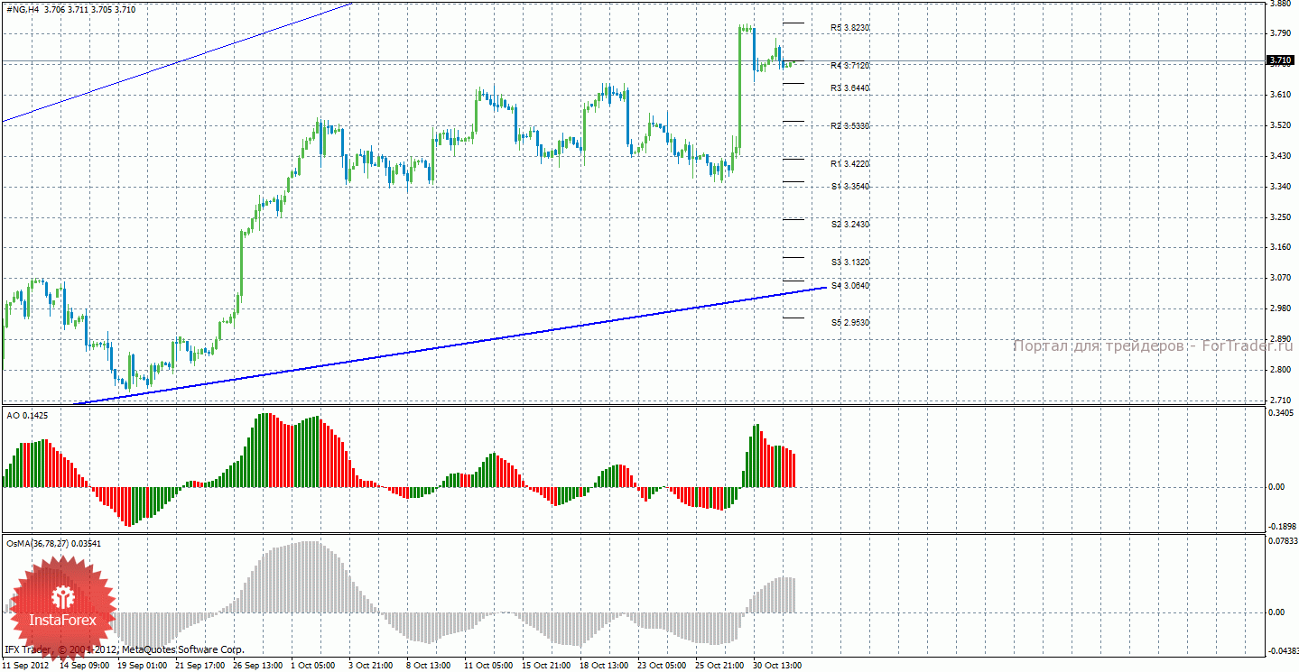 Анализ природного газа за 1 ноября показывает то, что цена оттолкнулась от уровня сопротивления 5 и начала коррекционное движение вниз. Целью для продолжения восходящего движения сейчас выступает только 3,8230, больше уровней сопротивления нет. Для возможности торговли с этой целью требуется закрепление цены выше уровня R4 – 3,7120. В случае отскока от этого уровня может продолжиться коррекция с целями 3,6440 и 3,5330. Восходящая линия тренда поддерживает торгующих на повышение, но у нее достаточно малый угол наклона и цена довольно далеко от нее находится, слабой ее по-прежнему назвать нельзя. Индикатор Awesome показывает локальное нисходящее движение, последний закрытый бар окрашен в красный цвет, что сигнализирует о коррекционном движении. OsMA также развернулся вниз, что сигнализирует о нисходящем движении цены на газ и в более долгосрочной перспективе.
