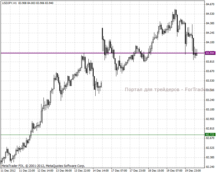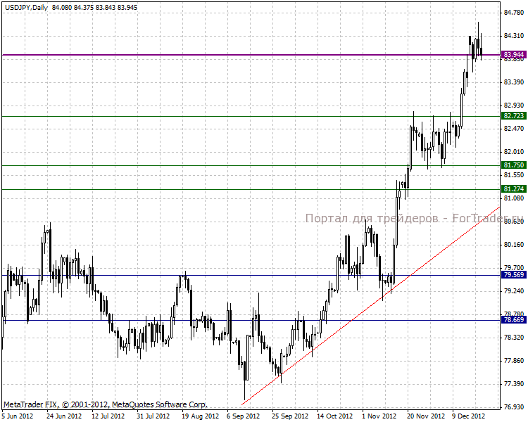 Дневной ценовой график показывает, что дальнейшее боковое колебание в диапазоне 84.377-82.927 пунктов может продолжиться до начала февраля 2013 года. Но все-таки в среднесрочной перспективе рекомендуем придерживаться лонговых позиций, основная долгосрочная цель стоит в отметке 86.895 пунктов.