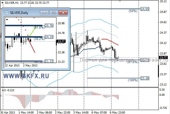 Цены на серебро отошли от недавних максимумов и наметили понижательную динамику. Несмотря на то, что выглядело все хорошо для роста, цены на серебро снизились. Традиционно делаю два варианта движения цены на неделю, основной красный и альтернативный зеленый. Значимые уровни на сегодня отмечены на часовом графике. Индикатор АО находится в отрицательной зоне и снижается, указывая на желание инструмента, снижаться. Индикатор тренда указывает на снижение. Sell от 24,05 или выше со стопом 24,15. Цель 23,70. Не забываем ставить безубыток при первой возможности.