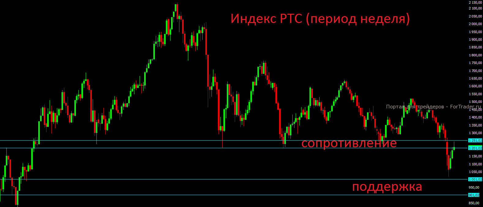 Сегодняшний день, с точки зрения техники, очень важен для российского рынка и если он закроется в минусе, хотя бы с потерями чуть более 1%, то мы получим окончательное подтверждение разворота не только на часовом и дневном периоде, но возможно и на недельном. Если закрытие недели произойдёт ниже отметки 1200 пунктов, то на недельном графике получится разворотная свеча и можно будет смело готовиться к дальнейшему снижению в ближайшие 2 недели, до отметок 1100-1050 по индексу РТС.