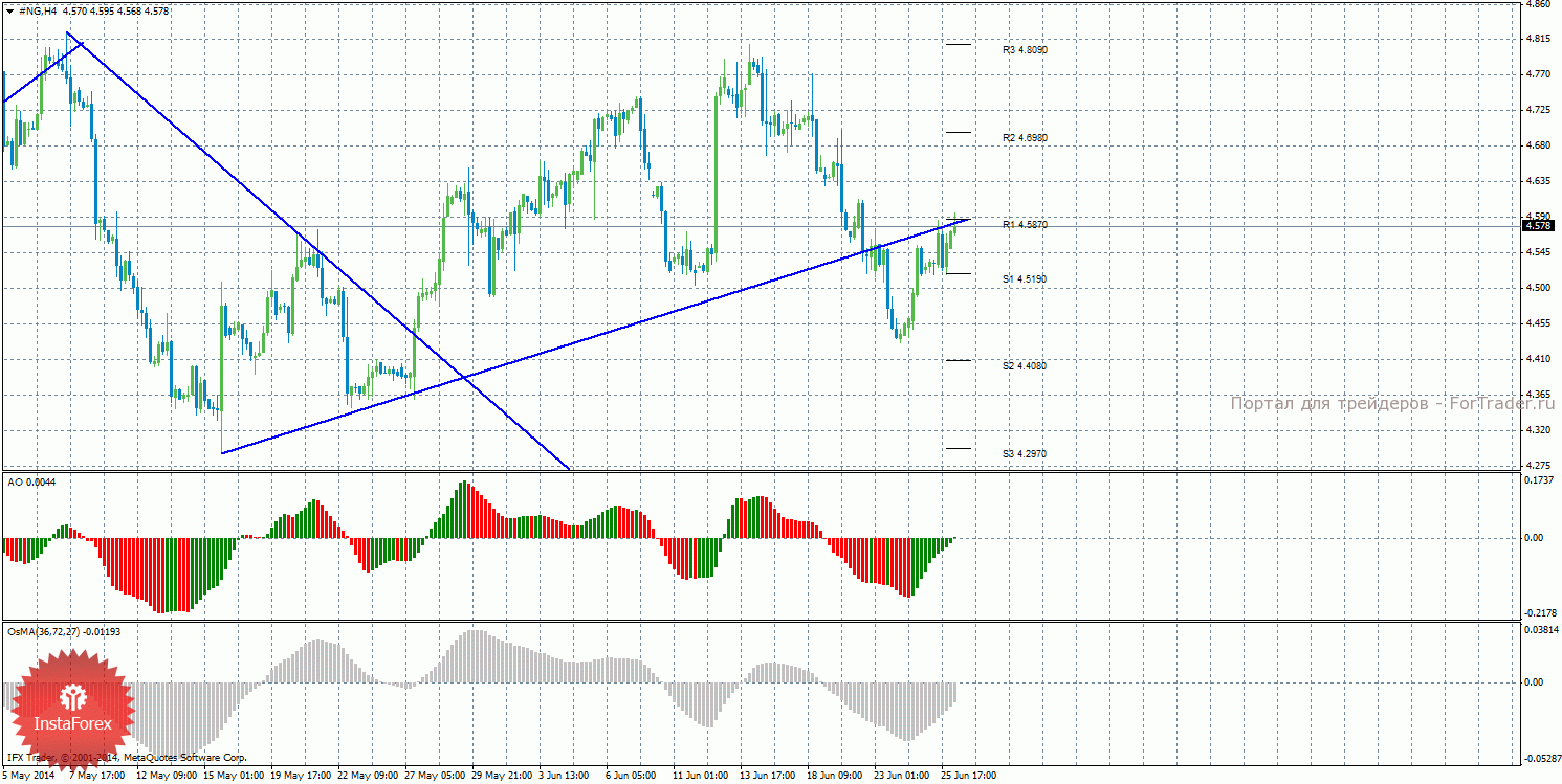 Анализ природного газа за 26 июня показывает, что цена продолжает корректироваться, о чем сигнализируют оба индикатора, направленные наверх. На данный момент актуально нисходящее движение с целями уровни поддержки S1 – 4,5190 и S2 – 4,4080, если цена отскочит от уровня 4,5870. Целями для продолжения восходящей коррекции выступают уровни 4,6980 и 4,8090, если цена закрепится выше уровня 4,5870. Восходящая линия тренда больше не оказывает поддержку торгующим на повышение, цена закрепилась ниже нее, поэтому сейчас являются актуальными короткие позиции. Индикатор Awesome показывает локальное восходящее движение, последний закрытый бар окрашен в зеленый цвет. OsMA также направлен наверх, что сигнализирует о восходящем движении цены на газ и в более долгосрочной перспективе. Отскок цены от уровня 4,5870 может спровоцировать завершение коррекционного движения.