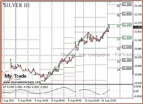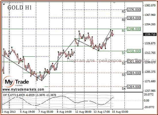 Сегодня утром золото отметило максимум недели, но выше 1348,00 вряд ли пройдет. Если все же это случится, то вероятно цена поднимется к 1400,00. Пока такой сценарий маловероятен, но за неимением другого рассматриваем этот.