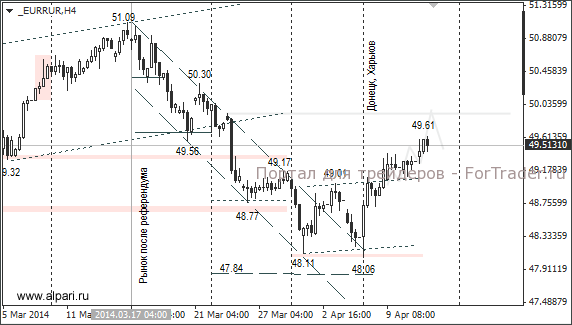 В связи с этим в понедельник утром было проведено экстренное заседание в ООН, чтобы снизить напряжённость в восточных областях Украины. На заседании представитель РФ Виталий Чуркин призвал Запад вмешаться в ситуацию и удержать действующие власти страны от насилия. Нужно отметить, что сегодня валютный рынок в Азии открылся гэпами по евро/доллару и кросс-парам с йеной. Такое открытие торговой сессии может напрямую быть связано с событиями на Украине или выступлением М. Драги. В любом случае, это два знаковых события для российского рубля.