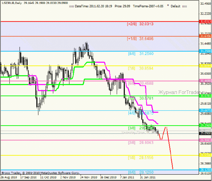 Дневной график USDRUB. На прошлой неделе нисходящий тренд продолжил свое развитие. Цена закрепилась за уровнем 29.2969[3/8] и снижение продолжается. Уровень 29.2969[3/8], не является сильной поддержкой, он не оказывает влияния на цену, когда не развивается боковое движение в канале (3/8 – 5/8), но зато следующий уровень, который встретит цена может оказывать поддержку. Более того, это сильный уровень и от него есть не малая вероятность восходящей коррекции. Предположительно это будет небольшая, локальная коррекция, судя по нисходящему движению, она окончиться уже на уровне 29.2969[3/8]. Максимальный потенциал развития этой коррекции ограничен главным уровнем поддержки/сопротивления 29.6875[4/8]. Основная цель по-прежнему находиться на уровне 28.1250[0/8].
