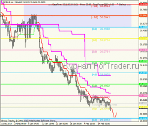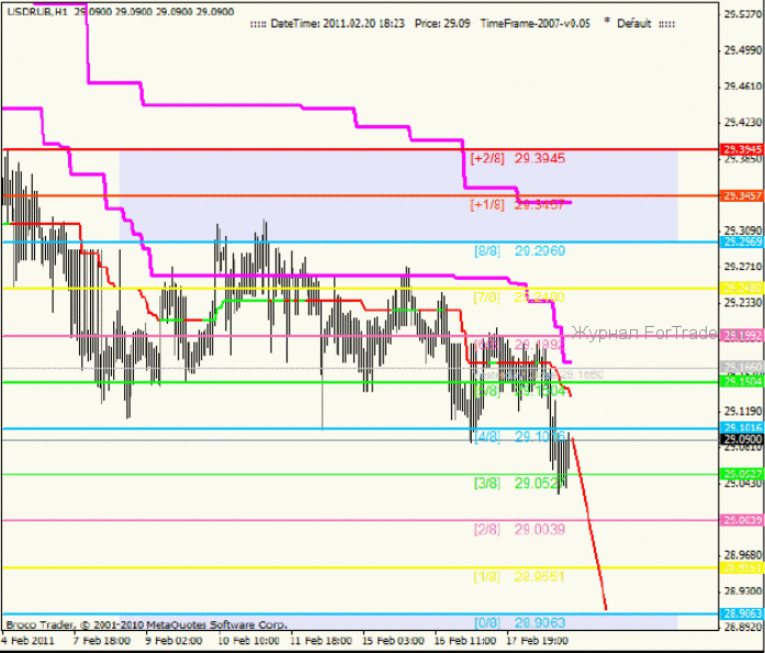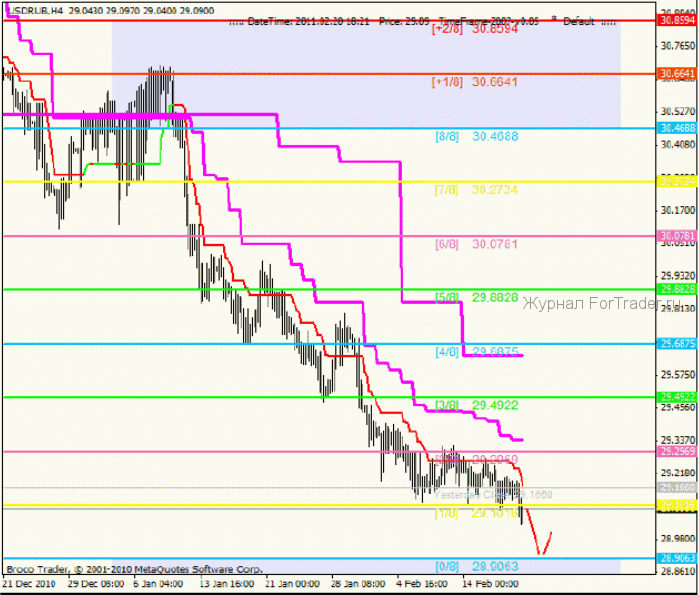 Четырехчасовой график USDRUB. Уровень 29.1016[1/8] был пробит и сейчас цена закрепляется ниже него. Как вы помните, это очень важный разворотный уровень, реакция на эту отметку определяет дальнейшую перспективу развития на не малый срок. В плане поддержки/сопротивления этот уровень слаб, но зато обладает необычными и очень сильными свойствами. Если в ходе нисходящего движения, на нем вдруг происходит остановка, за ней следует два-три ретеста и затем начинается восходящее движение. В данном случае, события развивались именно по такому сценарию, но цена преодолела уровень 29.1016[1/8] вниз. Вариант с разворотом и движением к уровню [4/8] отменяется, цена продолжит снижение. От уровня 28.9063[0/8] высока вероятность отскока.