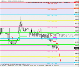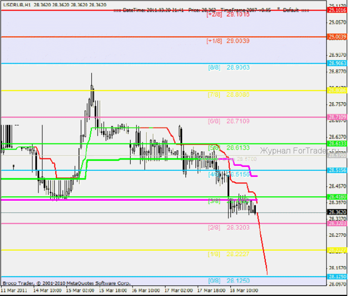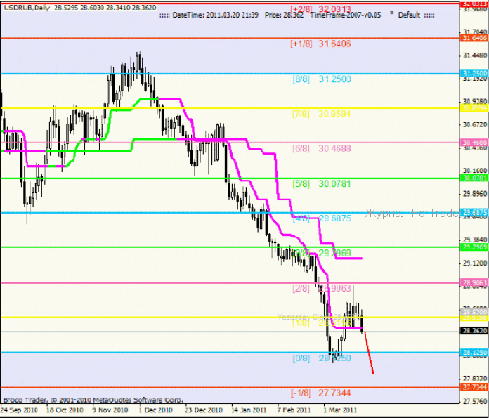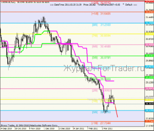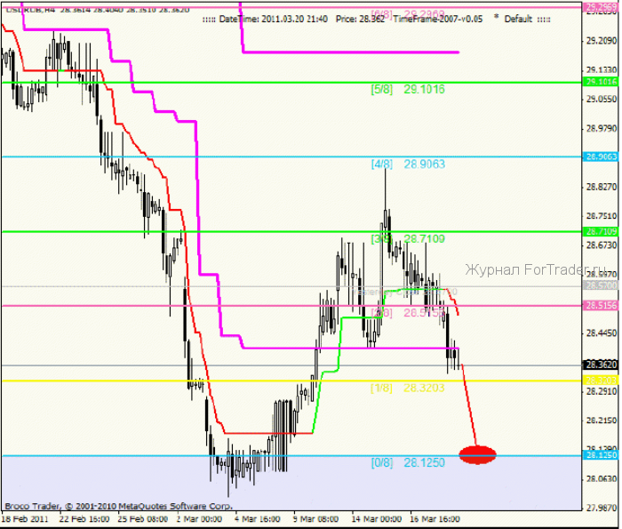 Четырехчасовой график USDRUB. От уровня 28.1250[0/8] произошла восходящая коррекция. Это один из самых сильный уровней и он оказывал поддержку. Уровень [0/8], отделяет зону перепроданности от остальной части октавы, поэтому даже если он преодолен, вероятность восходящей коррекции не исчезает, ведь зона перепроданности так же может оказывать поддержку. В данном случае восходящее движение продолжилось до уровня 28.9063[4/8]. Цель сразу была обозначена на этом уровне, в соответствии с анализом дневного графика. Цена развернулась немного не доходя до этой отметки, но это не меняет ситуацию. Разворот произошел и нисходящий тренд снова в силе, в скором времени ждем достижения уровня 28.1250[0/8].