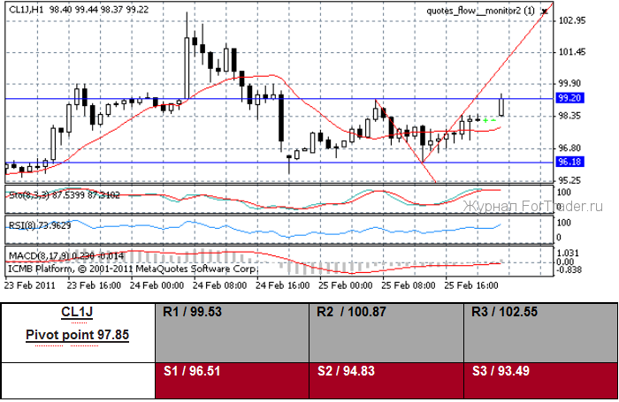 (Bloomberg) — Сырая нефть повысилась, покрывая самую большую еженедельную прибыль за два года, в связи с предположениями о том, что суматоха в Ливии распространится на ближневосточных производителей нефти. Зерно подскочило, двигая пределы сырья к рекордным значениям. Вчера нефть выросла к 29-месячному максимуму на фоне оценок, что добыча нефти в Ливии была сокращена почти на две трети. Цена понизилась ниже 100$ за баррель после заявления Саудовской Аравии, США и Международного энергетического агентства, что они могут компенсировать любой сбой ливийский поставки. Сегодня отчет показал, что американская экономика, в четвертом квартале, расширилась меньше, чем прогнозировалось. Фьючерсы на нефть с поставкой в апреле поднялись на 60 центов, или 0.6 процента, к 97.88$ на Нью-Йоркской товарной бирже. Вчера цена достигла 103,41$, самая высокая суточная цена с 29 сентября 2008 года.