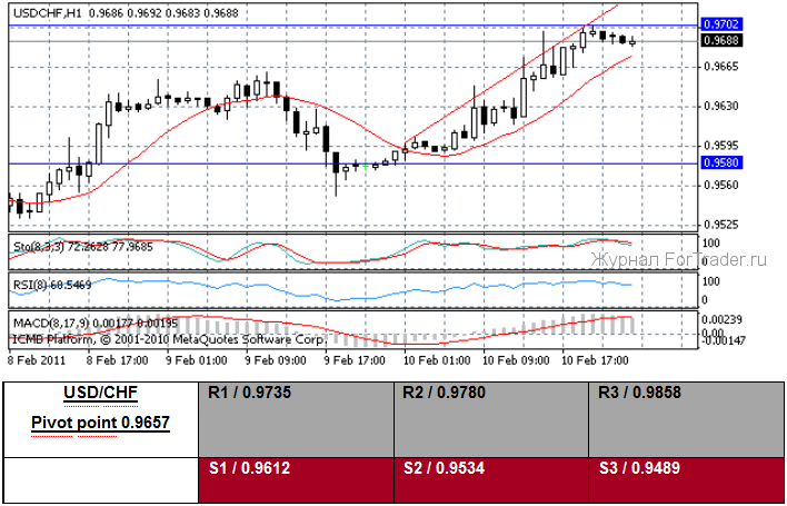 (Reuters) — Швейцарский франк достиг сессионного минимума против евро и доллара, в четверг, после более слабого, чем ожидалось, чтения швейцарских потребительских цен, которое предполагает, что инфляционное давление в стране осталось низким. Данные показали, что швейцарские потребительские цены повысились на 0.3 процента относительно прошлогоднего января, меньше чем прогнозируемое повышение на 0.5 процента. Цены упали на 0.4 процента по сравнению с предыдущим месяцем, больше чем прогнозировалось -0.1%. Швейцарский франк упал по всем данным, толкая евро EURCHF=R вверх, к максимуму дня 1.3175, по сравнению с 1.3144 за день до этого. Долларовый CHF = повысился примерно на 30 пипсов, к сессионному максимуму 0.9648.