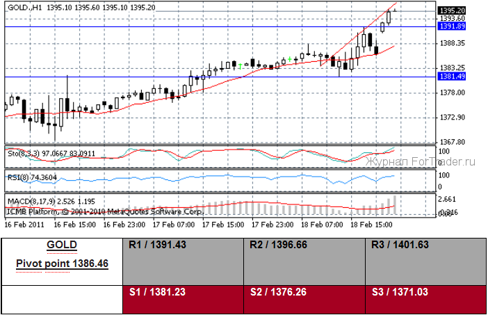 (Bloomberg) — Золото поднялось выше 1 390$ за унцию в пятницу, показав лучший еженедельный результат с декабря, подкрепленный страхами европейского долгового кризиса, возрастающей инфляцией и растущими волнениями на Ближнем Востоке. Прибыль слитка вызвала резкие инвестиции в серебро, которое взлетело до 31-летнего максимума, дальнейшее расширение прибыли серебра над золотом и отправку золото-серебряного соотношения к самому низкому уровню за 13 лет. Золото также получает преимущества в качестве зоны безопасности, поскольку заботы о политической стабильности региона вспыхнули на этой неделе на фоне волнений, распространяющихся после протестов в Тунисе, и сброса лидеров в Египте. Спот золота повысился на 0.3 процента до 1 386,75$ в 14:34 EST, ранее поразив пятинедельный максимум 1 391,75$. Слиток повышался пять сессий подряд — самой длинная полоса с сентября. И увеличился почти на 3 процента в течение недели.