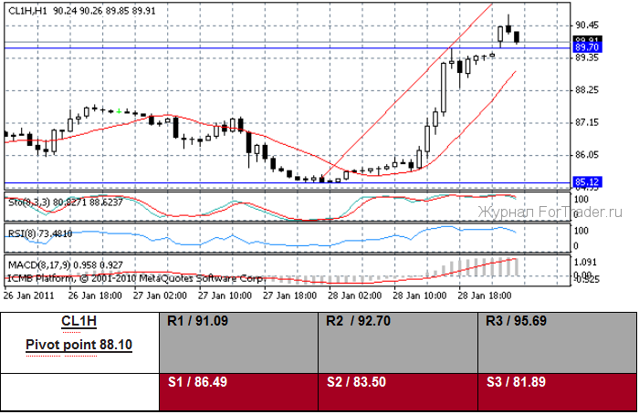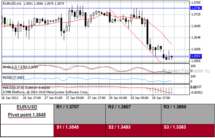 Евро обесценился вчера против доллара США. Единая валюта протестировала уровень 1,3583 US$ и была ограничена уровнем $1,3745. В американских новостных данных, выпущенных вчера, индекс затрат на содержание персонала Q4 поднялся на 0.4 %, в то время как валовой внутренний продукт Q4, пересчитанный на год, увеличился на 3.2 %, но оказался ниже прогнозируемых 3.5 %. Индекс цен валового внутреннего продукта Q4 поднялся на 0.3 %, и базовый индекс PCE Q4 увеличился на 0.4 % q/q. И, наконец, заключительный январский индекс потребительского доверия от Мичиганского университета сплотился к 74.2. Американский Министр финансов Geithner (Гейтнер) сообщил, что финансовые давления на государства «уменьшаются», но предупредил, что американский финансовый путь «неустойчив». Данные, выпущенные в европейской зоне сегодня, показали, что декабрьский EMU-16 денежных масс M3 стал выше на 1.7 % y/y. Трейдеры зафиксировали прибыль сегодня, когда единая валюта оказалась не в состоянии преодолеть технически важный уровень 1,3745 US$. Некоторая слабость пары обусловлена возрастанием геополитических напряженных отношений в арабском мире, после усиливающихся беспорядков в Египте. Некоторые трейдеры считают, что президент Mubarak (Мубарак) будет вынужден отказаться от должности, таким же образом проходят народные восстания в Тунисе и Йемене, меньше в Алжире и Марокко. Потенциальная неустойчивость в этой области мира может привести к более высоким ценам на энергию, вследствие политической неуверенности, и, как следствие, сегодня месячные фьючерсы сырой нефти NYMEX поднялись более, чем на 3,00 US$.