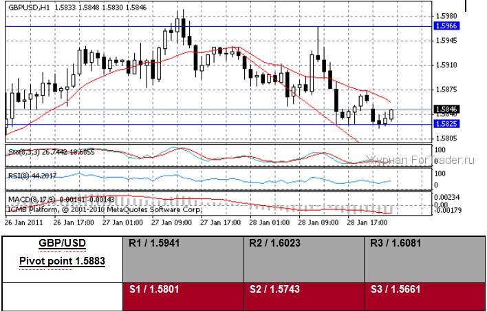 Британский фунт обесценился против доллара США сегодня, когда кабель протестировал цену на уровне 1.5825 US$ и был ограничен уровнем 1.5965 US$. Данные, выпущенные вчера ночью в Великобритании, показали, что индекс доверия потребителей от GfK ухудшился к — 29 от предшествующего уровня — 21. Министр финансов Великобритании, вновь имеющий «надежную» фискальную политику, предоставляет Государственному банку Англии больше возможностей по денежно-кредитной политике. Газета Государственного банка Англии опубликовала на этой неделе сообщение, что требования достаточности капитала, предусмотренные в проекте Базель- III «слишком слабы» и указала, что британская банковская система может противостоять более жестким потребностям в капитале. На этой неделе сообщалось, что Комитет по Денежно-кредитной политике Государственного банка Англии проголосовал 6 к 3, чтобы не изменять процентную ставку в январе. Два участника голосовали, чтобы увеличить процентные ставки, в то время как один голосовал, чтобы расширить программу покупки активов BoE. Бывший член комитета Денежно-кредитной политики Государственного банка Англии Blanchflower (Блэнчфлауэр) на этой неделе сообщил, что центральный банк стремился к более слабому фунту, когда он был там высшим чиновником.