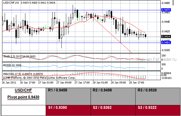 Швейцарский франк повысился относительно доллара США сегодня, в то время как доллар протестировал 0.9402 CHF и был ограничен уровнем 0.9470 CHF. Франк был силен по всем направлениям, поскольку его апелляция зоны безопасности побудила трейдеров искать убежища из-за политической нестабильности, которая захлестнула некоторые арабские страны. Данные, выпущенные вчера в Швейцарии, показали январское значение опережающего индикатора экономического барометра KOF, упавшим к 2.10 от пересмотренного в печати декабрьского значения 2.11. Швейцарские данные, которые публикуются на этой неделе, включают розничные продажи в декабре, январский PMI, и декабрьский торговый баланс. Председатель Швейцарского национального банка Hildebrand (Хильдебранд) на этой неделе сообщил, «Если Европа не преуспевает; рано или поздно такая же проблема появится в Швейцарии также. Мы смотрим с определенным оптимизмом, что Европа занимается проблемами”. Хильдебранд также отметил, что швейцарский экономический рост может уменьшиться к +1.5 % в этом году от оценочного темпа роста ВВП +2.5 %. Член правления Швейцарского национального банка Danthine (Дэнтайн) на этой неделе повторил, что роль центрального банка в том, чтобы “гарантировать стабильность цен”.