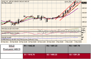 (Bloomberg) — Золото повысилось до рекордных 1 435,60$ за унцию в Нью-Йорке, поскольку волнение в Ливии стимулировало спрос на металл как инвестиционный приют. Оппозиция Ливии получила поддержку со стороны американских и европейских стран, в то время как Муаммар Каддафи послал войска, чтобы вернуть утраченные территории. Протесты распространились в регионе частично потому, что цены на продовольственные товары взлетели. Сырая нефть в Нью-Йорке превысила 100$ за баррель сегодня, когда иранские протестующие столкнулись с силами безопасности в Техране. Золото повысилось 10-ый раз на 11- ти сессиях. “Продолжающееся насилие на Ближнем Востоке привлекает новых покупателей и продвигает золото на новую территорию, ” – сказал Frank Mcghee, главный дилер в Integrated Brokerage Services LLC в Чикаго. “Движение к экономическому оздоровлению падает. Сырье выше 100$ есть энергетический налог, который вынудит правительства поместить больше денег в систему. Наш старый страх стагфляции возвращается”. Фьючерсы на золото с поставкой в апреле достигли непревзойденного максимума после закрытия регулярных торгов на Comex в Нью-Йорке. Металл упал на 21.30$ или 1.5 процента к 1431,20$ в 13:49. Предыдущий внутридневной рекорд был 7 декабря 1 432,50$. Золото для немедленной поставки повысилось на 1.7 процента к рекордному значению 1 434,93$. Цена поднялась на 1.6 процента к 1 434,27$ в 16:01 нью-йоркского времени.