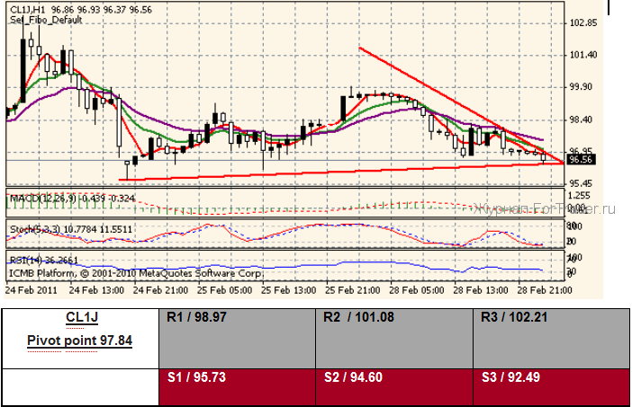 (Bloomberg) – Волатильность нефти уменьшилась в течение двух дней, так как базовые фьючерсы понизились более всего за две недели после того, как Саудовская Аравия предложила восполнять поставки, потерянные из-за волнения в Ливии. Нефть с поставкой в апреле упала на 91 цент, или 0.9 процента, чтобы рассчитаться по 96,97$ за баррель на Нью-Йоркской товарной бирже, самое большое дневное снижение с 11 февраля. Фьючерсы достигли самой высокой суточной цены с 29 сентября 2008 года по 103,41$ за баррель 24 февраля, отправляя волатильность опционов к восьмимесячному максимуму.