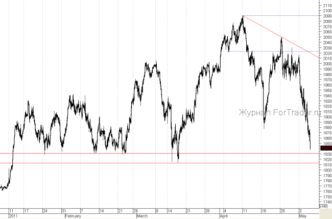 Три дня подряд акции и деривативы на отечественном фондовом рынке теряли в цене усиленными темпами в русле общемировых тенденций. Тот обвал который вчера прошел на рынках воистину войдёт в учебники истории, как и 6 мая 2010 года. Нефть теряющая 9% за день — такого ещё не бывало, и стало возможным лишь после начала нерыночных действий денежных регуляторов в прошлом году. Множество инвесторов сформировавших портфели ценных бумаг из отечественных акций за три торговых дня мая оказались в лучшем случае в точке безубыточности. Таким образом торги на отечественном фондовом рынке в 2011 году характеризуются значительными колебаниями в рамках расширяющейся формации, до нижней границы которой осталось порядка 4-х процентов, если анализировать график фьючерса на индекс РТС.