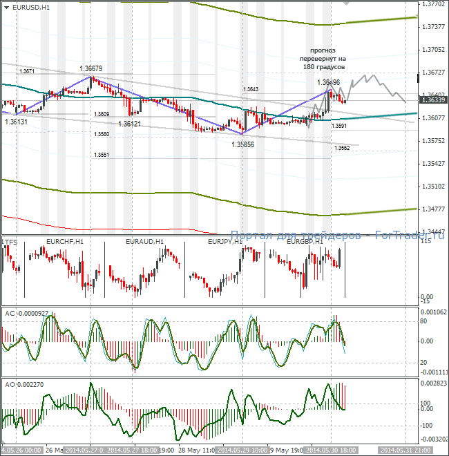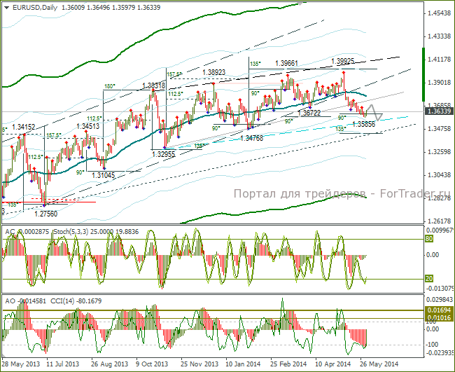 Если в понедельник будет пройден ценовой уровень 1,3670, то до 5 июня по евро надо ожидать коррекционный рост. Пока такой расклад получается на понедельник.