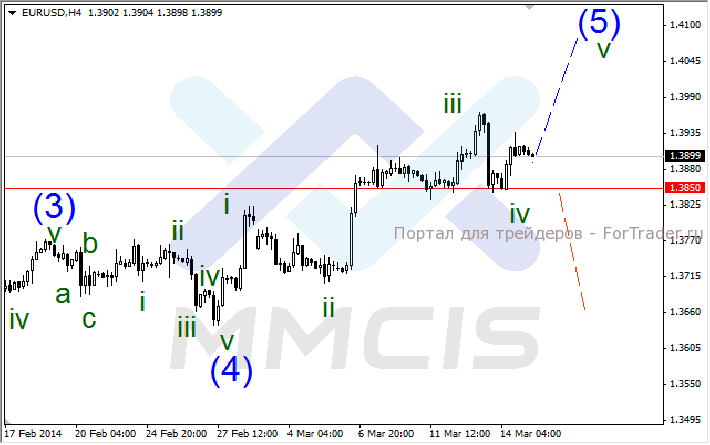 В качестве основного сценария рассматривается продолжение роста пары в волне «5» к уровню 1.4100. В качестве альтернативного сценария рассматривается пробой уровня поддержки 1.3850, что укажет на падение к следующему уровню 1.3700.