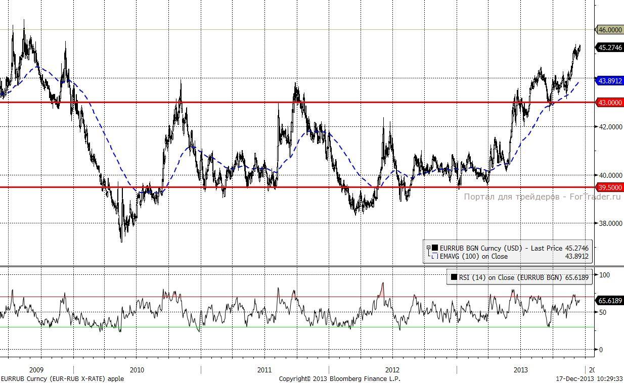 Европейская валюта чувствует себя достаточно уверенно по отношению к российскому рублю. Скользящие средние указывают на присутствие сильных «бычьих» настроений, погасить которые сможет лишь негативная статистика из Европы или рост цены на нефть. Согласно техническому анализу, до Нового года падение рубля может достичь уровня 46.00 за 1 евро.