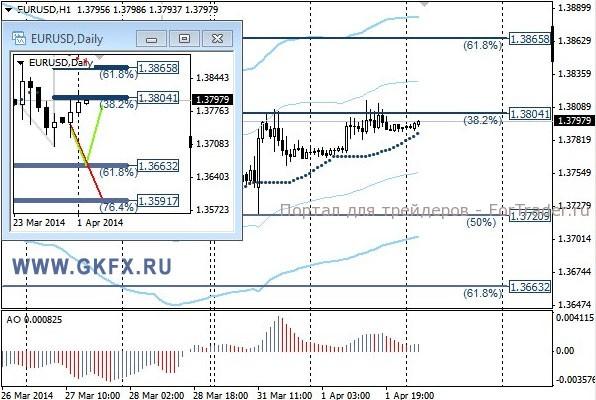 Пара EURUSD продолжает полсти вверх на комментариях представителей ЕЦБ. Вице-президент ЕЦБ Витор Констансиу заявил, что ЕЦБ не видит угрозы дефляции. Это идет в разрез с ожиданиями рынка, согласно которым многие ждут решительных действий. Вчера резких движений не наблюдалось и сегодня динамика может иметь подобный вид. Видимо до окончания заседания ЕЦБ, которое состоится в четверг, рынок не станет предпринимать активных действий. Даю рекомендацию с небольшими целями. На эту неделю традиционно рассматриваю два варианта возможного движения цены, основной красный и альтернативный зеленый. Значимые уровни на сегодня отмечены на часовом графике. Индикатор АО находится в положительной зоне и растет, указывая на желание пары двигаться вверх в данное время. Индикатор тренда указывает на рост. Преодоление 1,3780 позволит продать с целями 1,3765, 1,3740 и 1,3720.