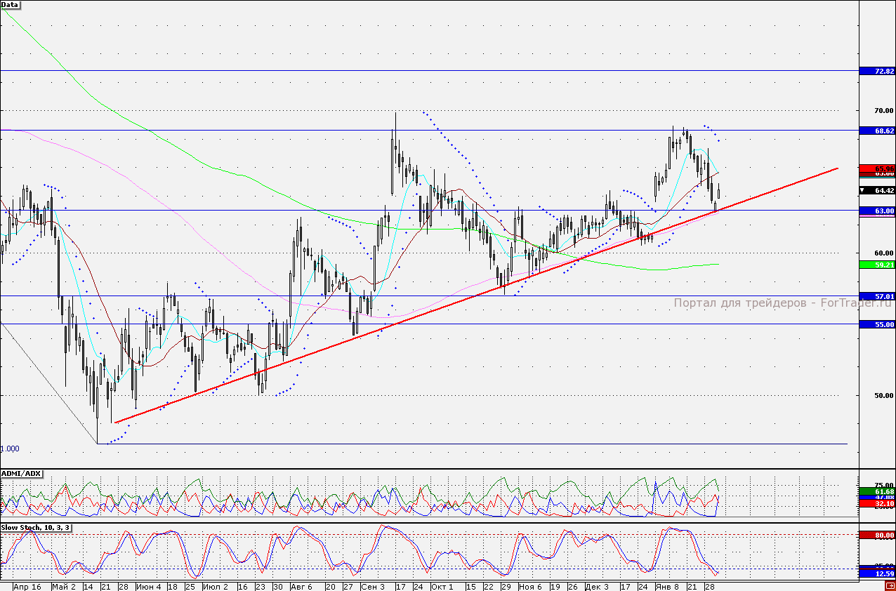 Динамику лучше рынка в первой половине сессии демонстрируют акции НЛМК. Бумаги продолжат отскок от линии восходящего тренда, действующего с мая прошлого года. В первой половине дня акции протестировали на прочность ближайшее сопротивление 65 руб., однако более мощным сопротивлением выступает район 65,70 руб., где сосредоточены 10- и 21-дневные скользящие средние. Вероятность достижения данного уровня достаточно высока. График осциллятора медленный Stochastic(10;3;3) находится в зоне перепроданности, при этом индикатор ADMI/ADX показывает, что на смену «медведям» приходят «быки» (линия «быков» снизу вверх пересекается с линией «медведей»), что не исключает вероятности продолжения позитивной динамики акций. Наш 30-минутный уже готов открыть длинные позиции по бумагам. Таким образом, длинные позиции стоит удерживать с ближайшей целью достижения 65,70 руб.