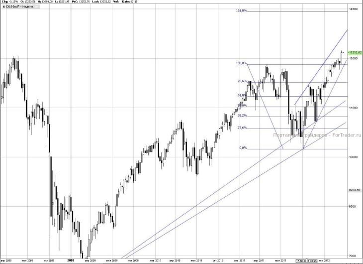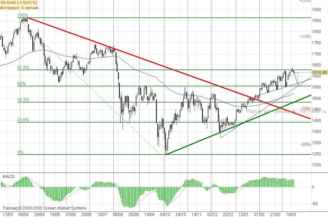 Опасаюсь, что, как и весной прошлого года, Америка отправится рисовать новые годовые пики, а российские индексы завянут под влиянием внутренних факторов. В прошлом году таким фактором было закрытие реестра крупных компаний. Что будет в этом году – сказать не могу. Просто техника предупреждает, что по индексу Dow Jones есть открытая цель в районе 13500 пунктов, а движение индекса ММВБ сильно ограничено сопротивлением 1625 пунктов.