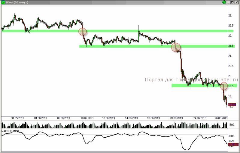 Сегодня цена дошла до цели снижения на 19 долл. Если мы посмотрим на часовой график серебра, то увидим, что цена продолжает двигаться в рамках нисходящего тренда, по классической для металлов схеме: образуется уровень поддержки, затем его пробой, снижение и образование нового уровня поддержки. Пока такая тенденция сохраняется, пытаться открывать длинные позиции, на мой взгляд, не стоит.