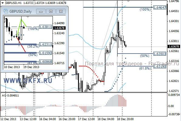 Пара GBPUSD уверенно росла в течение дня на сильной статистике по Великобритании. Только события в США смогли пару утихомирить. Тем не менее, пара поднималась ненадолго до максимумов с августа 2011 года, но в итоге опустилась ниже 1,6400. Вероятно, пара будет менее охотно снижаться, чем евро, поэтому рекомендаций не даю. На этой неделе по традиции рассматриваю два варианта возможного движения цены, основной красный и альтернативный зеленый. Значимые уровни на сегодня отмечены на часовом графике. Индикатор АО находится в положительной зоне и снижается, указывая на коррекцию перед возможным продолжением роста. Индикатор тренда указывает на рост. Вне рынка.