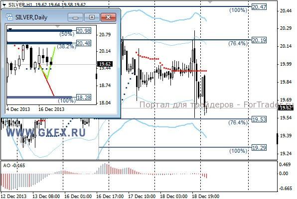 Цены на золото направились вниз после решения ФРС США сократить программу стимулирования экономики QE3. Резкого снижения золота не последовало, как я предполагал, но цены пошли вниз. Цены на золото торгуются сейчас у минимумов этого года и учитывая, что тренд по золоту направлен вниз, прорыв минимумов не за горами. Единственное что смущает это количество желающих продать, соответственно возможен маневр, чтобы всех удовлетворить, а потом вытряхнуть и направить цены вниз. В общем, думаю, что первое прохождение отметки 1211,0 будет ложным. Традиционно делаю два варианта движения цены на неделю, основной красный и альтернативный зеленый. Значимые уровни на сегодня отмечены на часовом графике. Индикатор АО находится в отрицательной зоне и снижается, указывая на желание инструмента двигаться вниз. Индикатор тренда указывает на снижение. Можно попытаться продать с короткими целями. Продажи от 1227,0 с целями 1,220,0, 1215,0 и 1190,0.