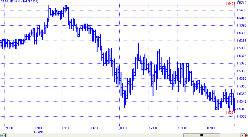 Динамика GBP/USD шла вразрез с динамикой EUR/USD. Пара продолжила начатое еще во время азиатской сессии снижение, даже несмотря на слабые данные по розничным продажам США, которые зарегистрировали падение на 0,4% вместо ожидаемых 0,0%. Виною всему технические факторы: после неудачной попытки пробить 1,54, пара начала нисходящее движение, отметив дневной минимум 1,5337.
