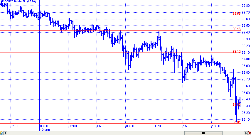 Пара доллар/иена в пятницу развила нисходящее движение, так и не сумев протестировать сопротивление 100,00. В рамках нисходящего движения пара преодолела несколько уровней поддержки и отметила локальный минимум на 98,04. К закрытию дня пара вернулась к отметке 98,30.